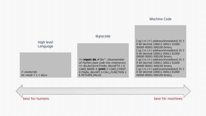 컴퓨터는 이진코드(0, 1)두개의 값만 알아들을 수 있다. 하지만 우리가 작성하는 자바스크립트는 0, 1이 아닌 영어에 가깝고 영어를 알고있다면 배우지 못한 사람도 대충은 알아볼 수 있고 배운다면 영어로 코딩 또한 가능하다.